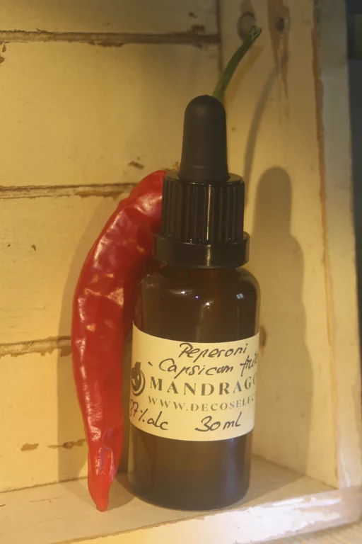 Für Muskeln / Verspannungen: 5–10 Tropfen Chili-Tinktur in 1–2 TL Öl (Olive, Sesam, Johanniskrautöl), sanft einreiben